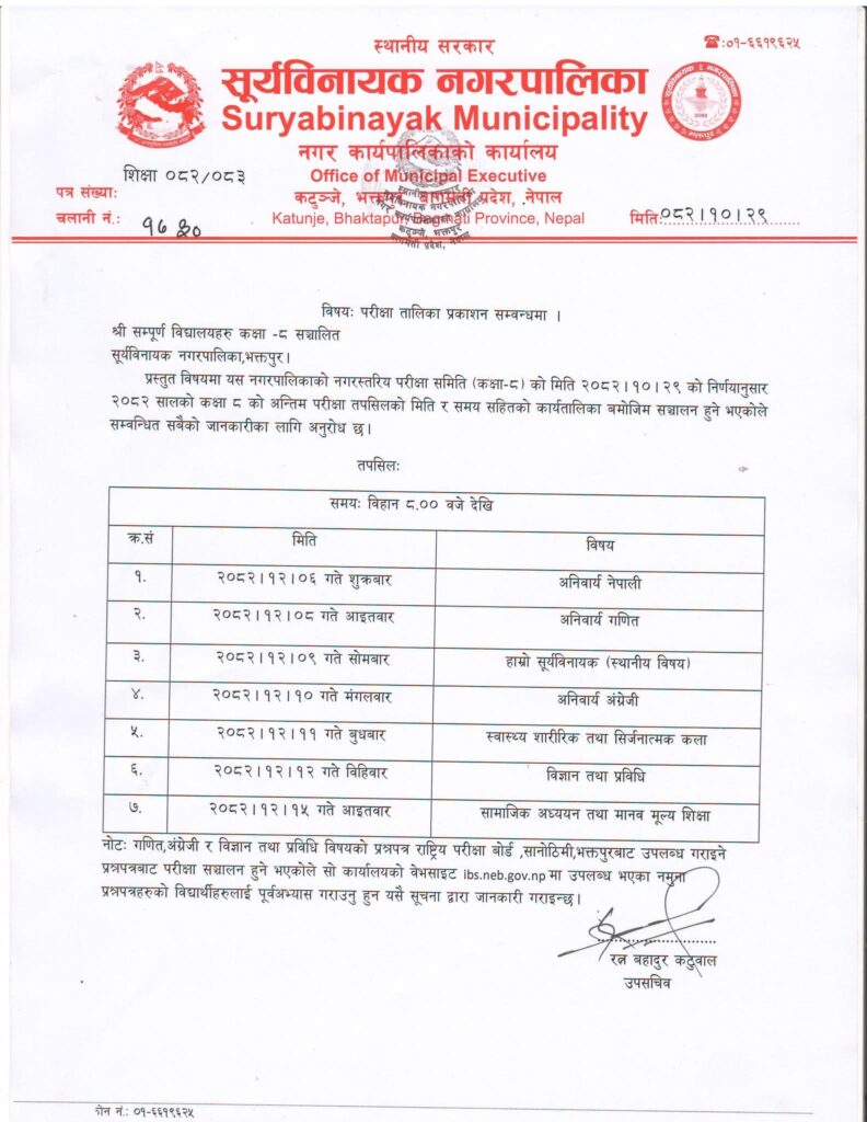 सूर्यविनायक नगरपालिकाले शैक्षिक सत्र २०८२ अन्तर्गत आधारभूत तह उत्तीर्ण परीक्षा (कक्षा ८) को परीक्षा तालिका सार्वजनिक गरेको छ। नगरपालिकाको नगर कार्यपालिकाको कार्यालयबाट प्रकाशित सूचनाअनुसार नगरस्तरीय परीक्षा समिति (कक्षा–८) को निर्णयअनुसार कक्षा ८ को अन्तिम परीक्षा तोकिएको मिति र समयतालिकाअनुसार सञ्चालन हुनेछ।